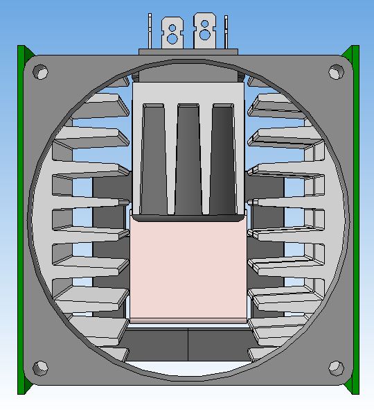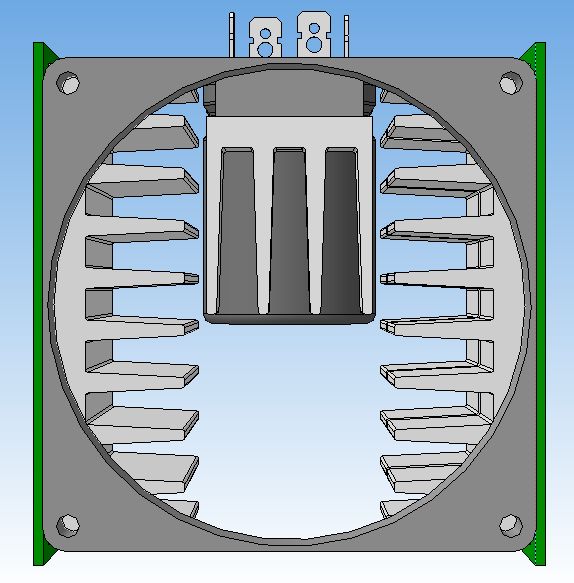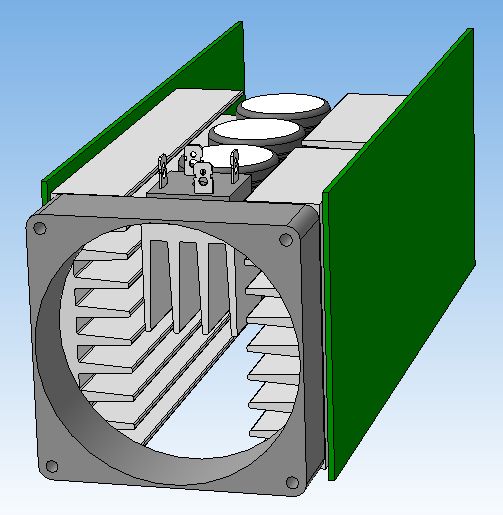 По поводу конденсаторов- идея в том, чтобы после прохождения воздуха через радиатор диодного моста он рассекался о круглый корпус первого конденсатора и направлялся равномерно на радиаторы диодов и транзисторов. Трансформатор или дроссель туда не влезут(расстояние между ...