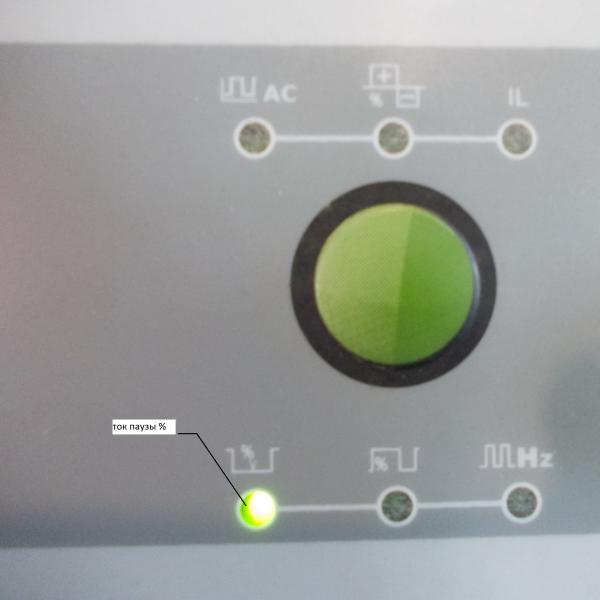 26. Индикатор выбора величины тока паузы (Импульсный режим) величина сварочного тока во время паузы, в процентном соотношении к величине сварочного тока импульса.