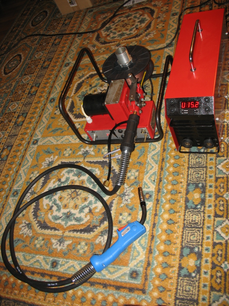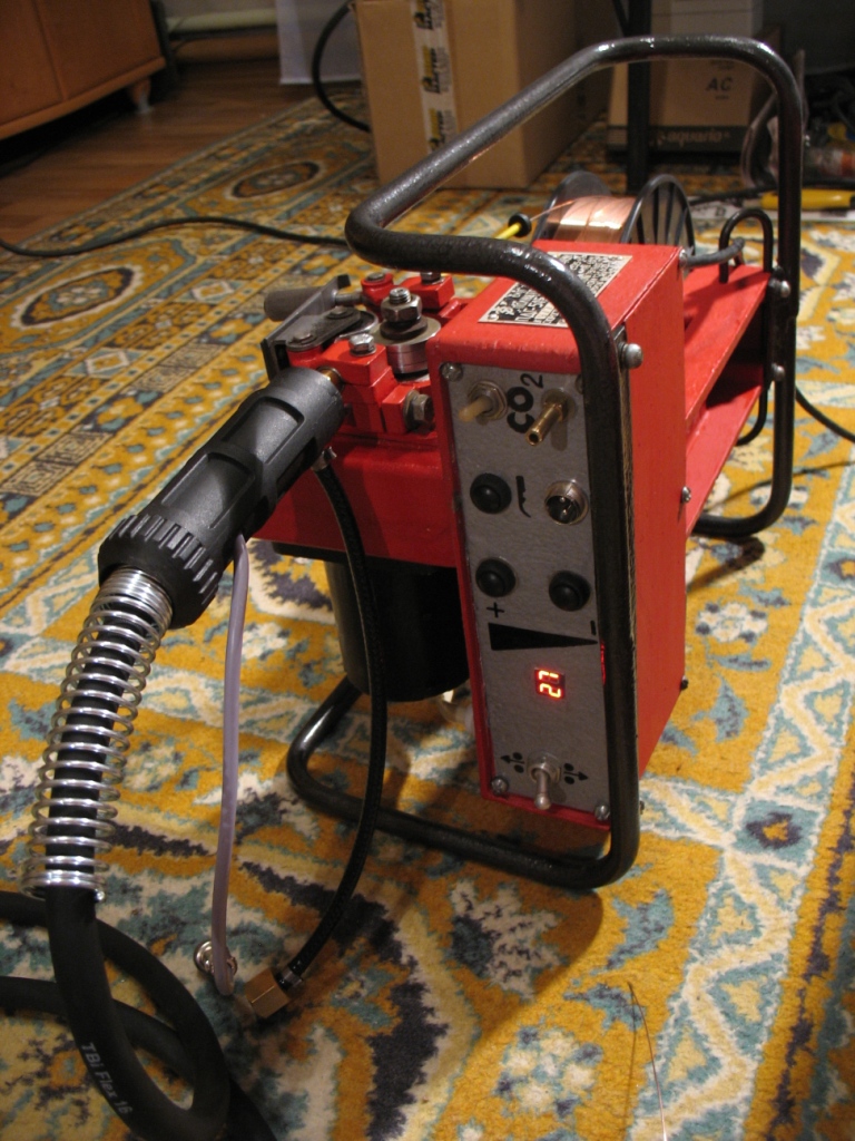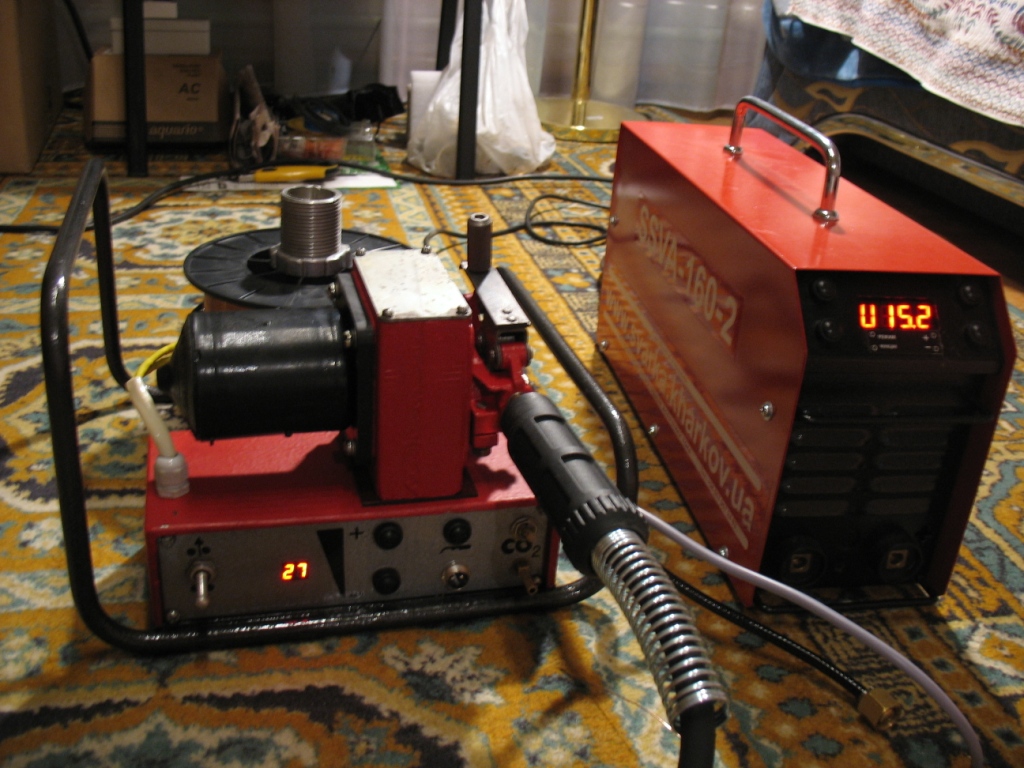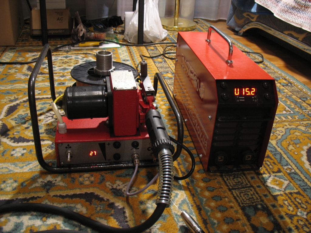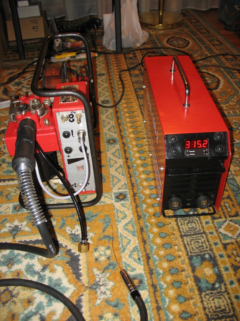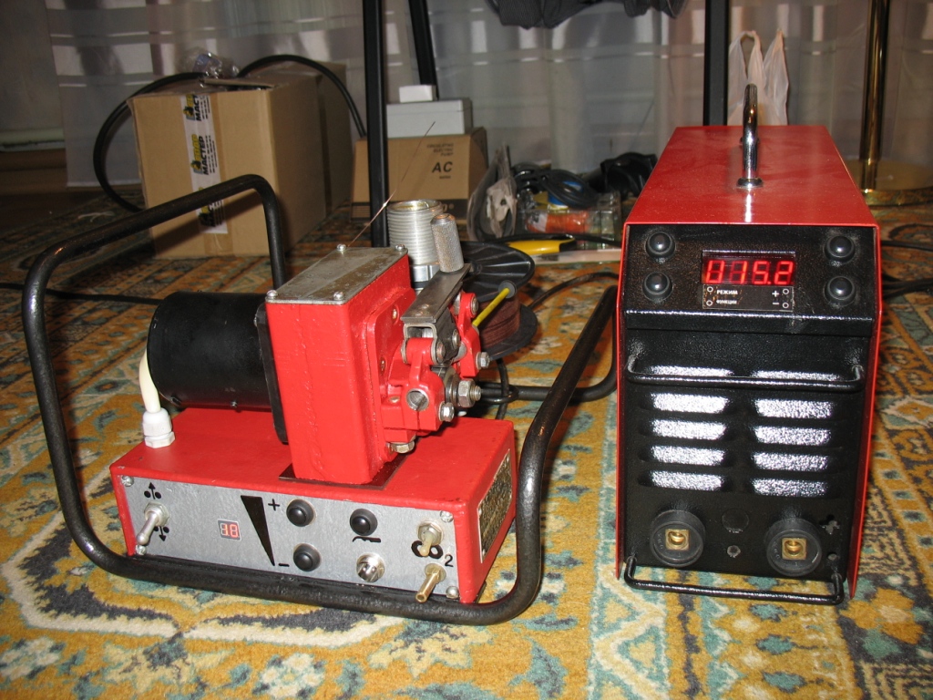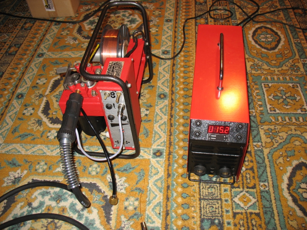 Все компоненты новые, основа - протяжка ПДГ-515УЗ, плата уравления с цифровой установкой и стабилизацией скорости подачи от SSVA-PU, клапан с подогревом оттуда же, двигатель 24 Вольт. Питание протяжки можно брать прямо от сварочной дуги!
