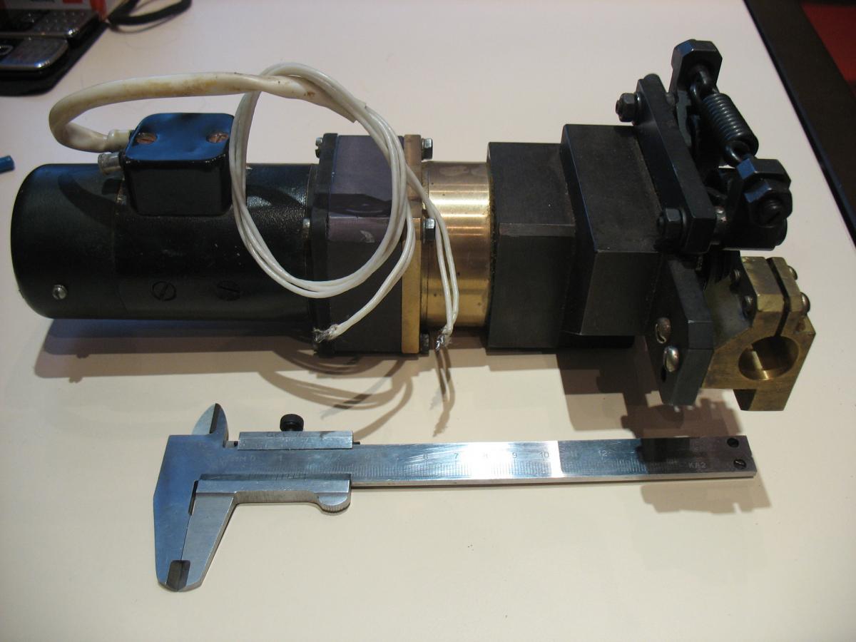 Двигатель 75 Ватт, независимое возбуждение, отличное качество исполнения. На статор 27В постоянки, на ротор 0 - 60 В постоянки. К двигателю прикручен планетарный 2х ступенчатый редуктор, а к редуктору - привод на ролики. Два ролика ведущие, 2 верхних прижимающие. Все сделано очень качественно, точно, и добротно. В комплекте дам ролики запасные и стягивающую пружину. Масса механизма примерно 4-5 кг. Снят с советского сварочного робота для сварки алюминиевой проволокой. Ролики могу выточить на заказ под нужный диаметр (по технологии из сцец стали + закалка. по цене + 80 грн).