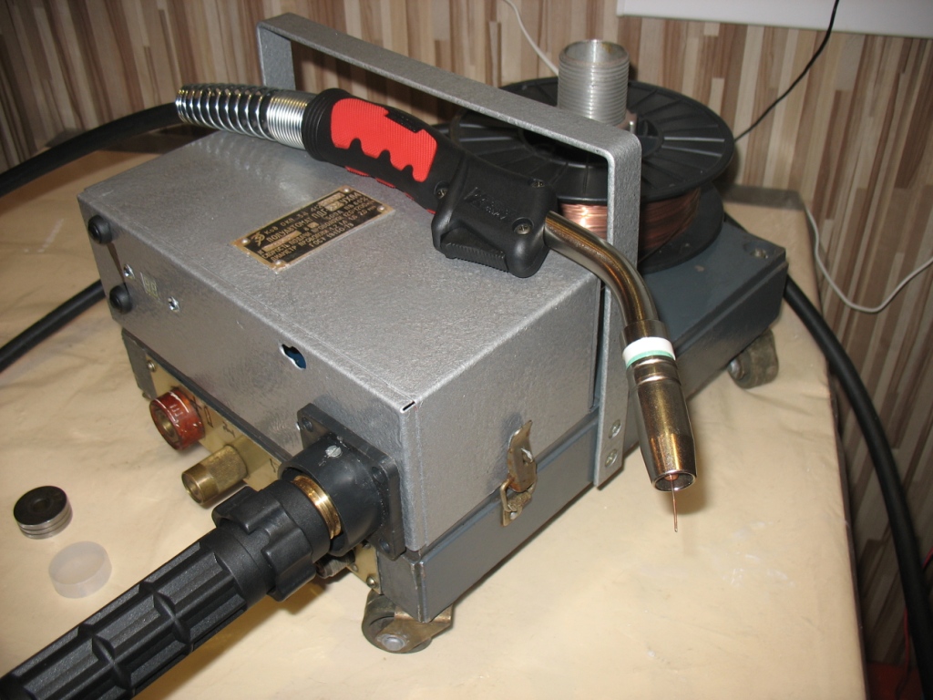 Плату взял от SSVA-PU, усиленную. Она обеспечивает стабильную подачу проволоки, независимо от колебаний питающего напряжения, и изменений усилий на валу (изгибов рукава и т.д.), есть обратная связь по току/напряжению, регулировка предгаза/постгаза, защита от КЗ и перегрузок.