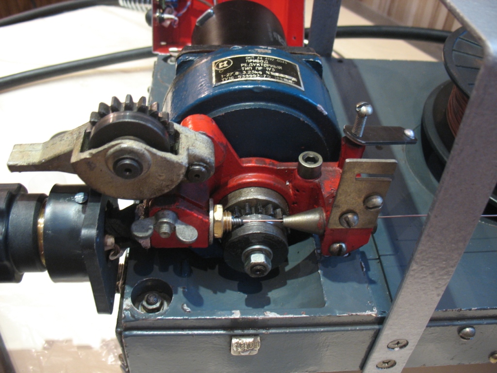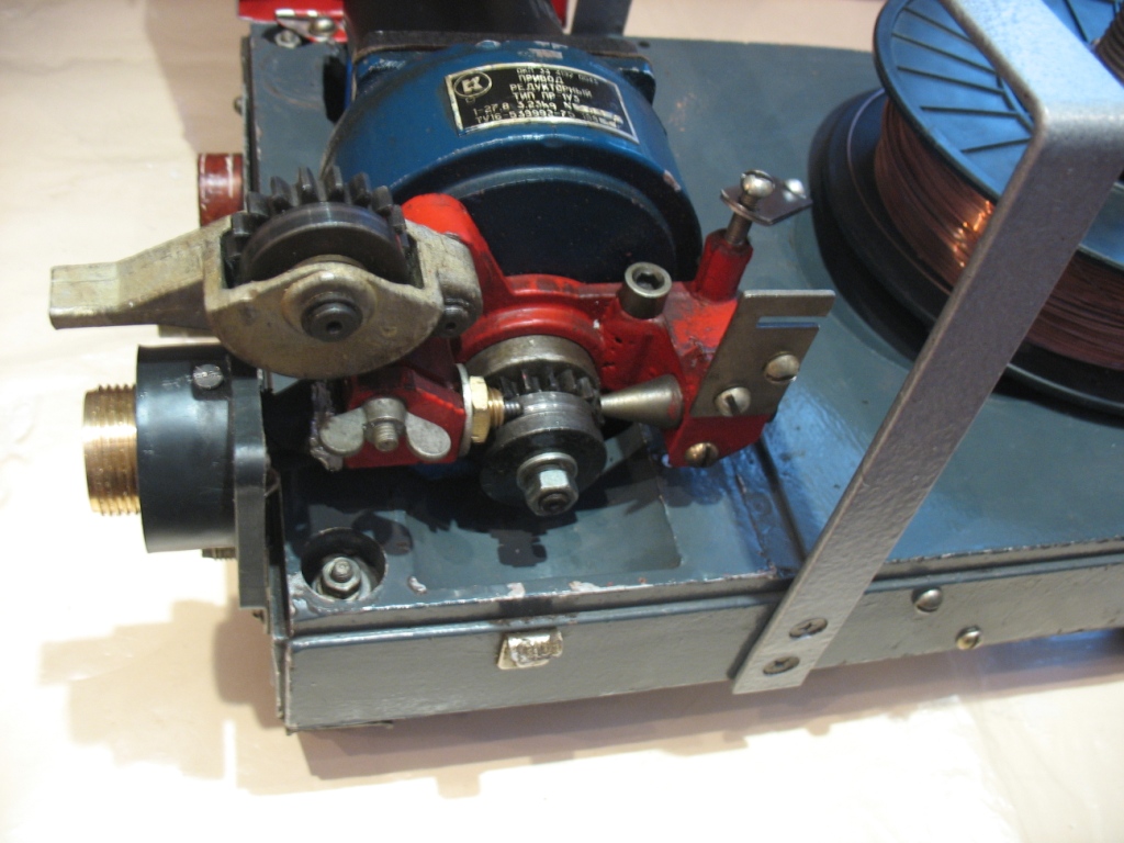 Моторредуктор с цилиндрической зубчатой передачей - отличаются надёжностью и имеют высокий ресурс эксплуатации, КПД. При том, все шестерни выполнены из стали, и вращаются на шарикоподшипниках, корпус редуктора металлический, прижимная скоба и крепление рукава - металлические, можно не боятся что отломается. В моторредукторе нет ни единой пластиковой детали. Зато в современных дорогих протяжках пластиковые даже шестерни редуктора. Ведомый вал на котором расположен подающий ролик установлен на массивных широко разнесенных в корпусе (по меркам данного узла) шариковых подшипниках (как мне кажется - 202 или 203 подшипник, если интересует, могу разобрать посмотреть точно). Вообще данные механизмы легко отхаживают по 3-3,5 тонны проволоки (600-700 катушек по 5 кг).