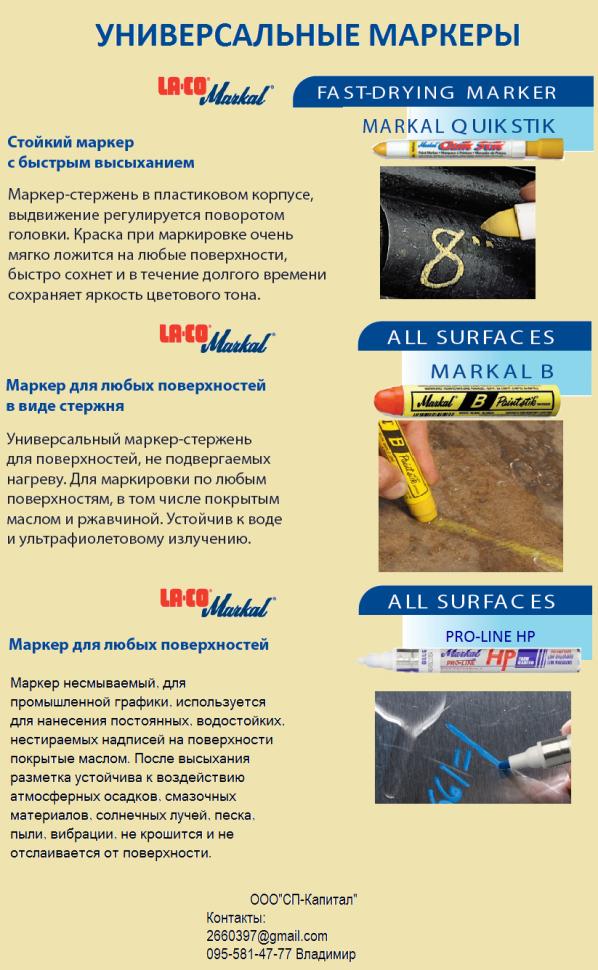 Добрый день!Наша компания является официальным представителем LA-CO Markal - производитель промышленных средств маркировки таких поверхностей как металл, нержавеющая сталь, камень, кирпич, асфальт, пластик, стекло, керамика, резина, каучук, картон, бумага, древесина,текстиль.