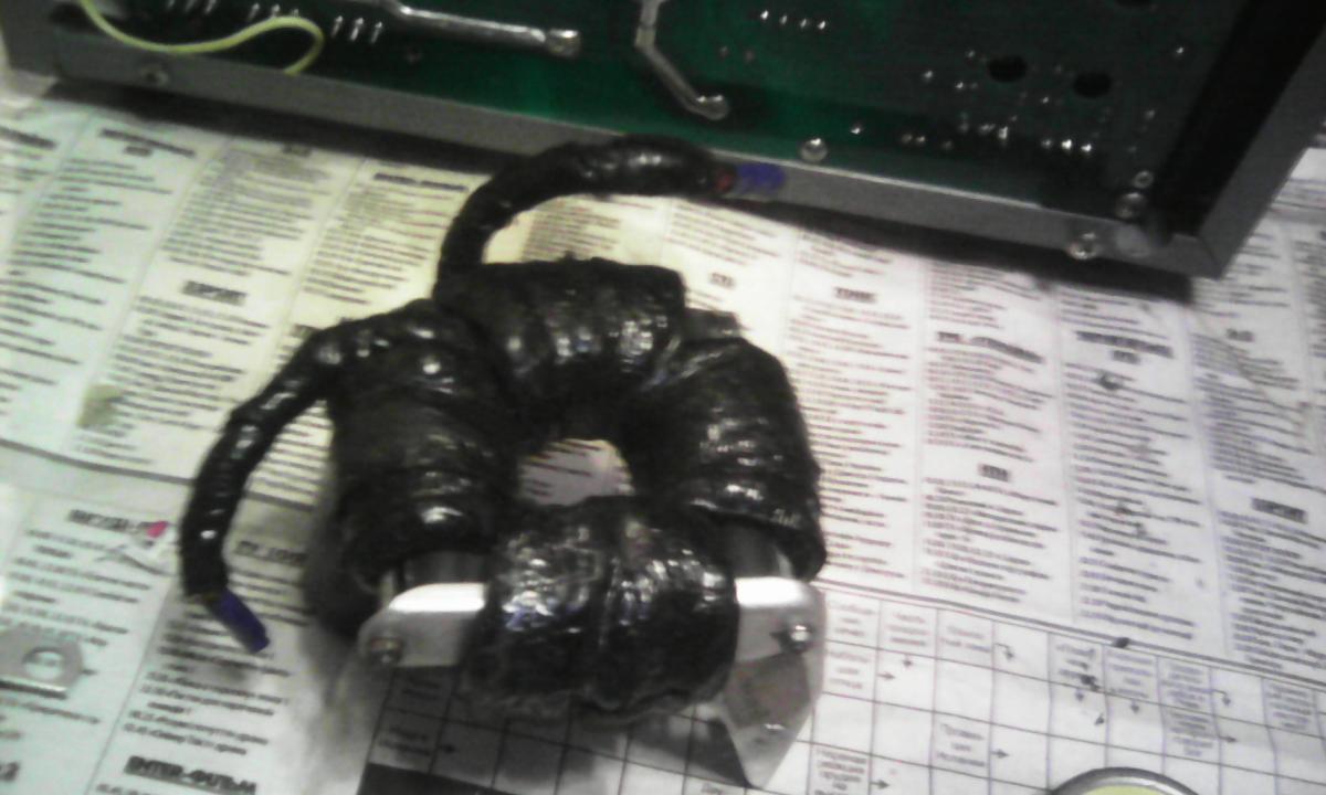 Намотал вот это чудо на сердечнике ТВС - 8 витков кабелем 16мм^2 по кругу сердечника (4 витка на сторону), зазор 5мм.