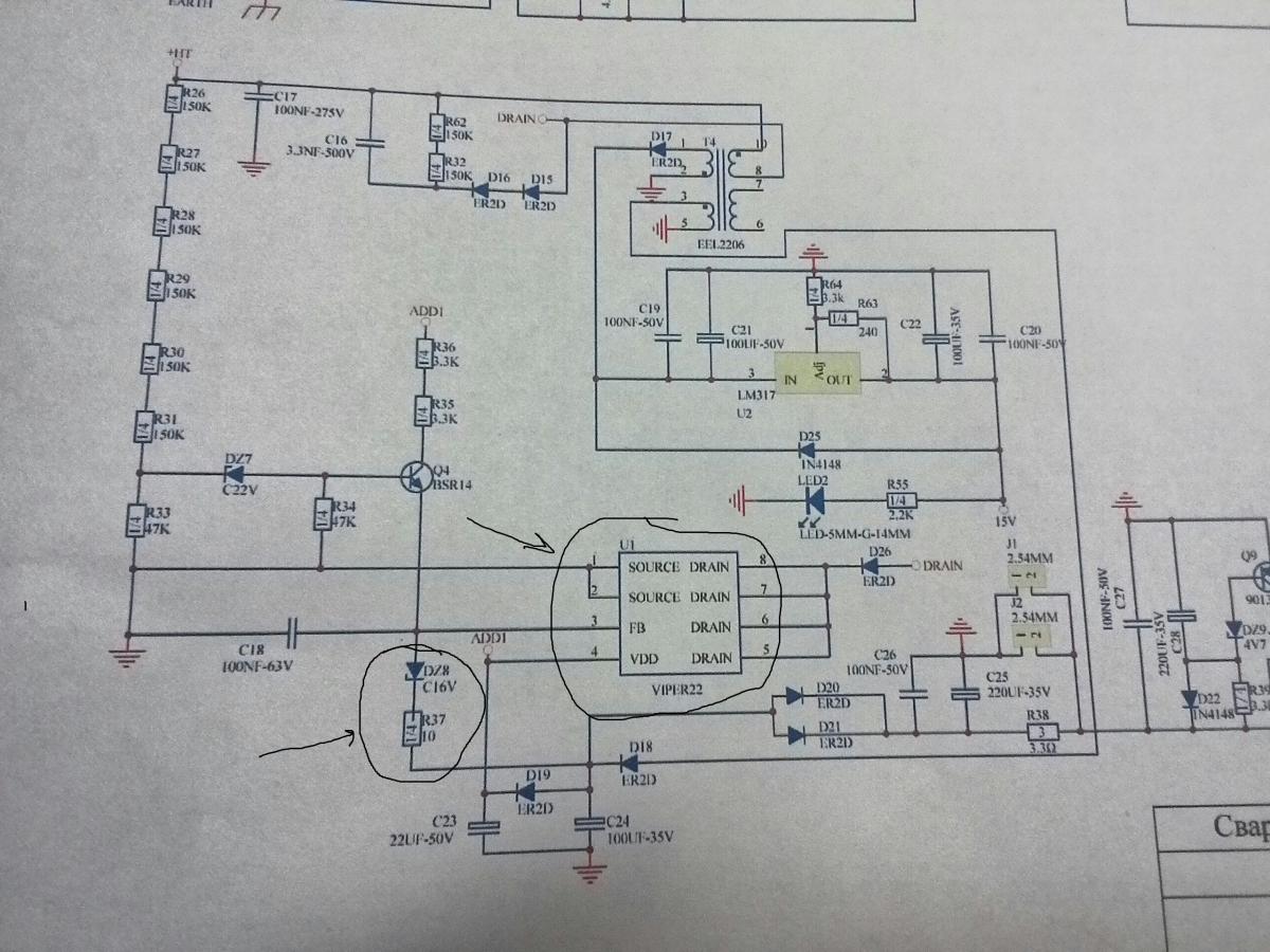спасибо уважаемые,вопрос в том на что внимание обратить,оставшиеся компоненты это конденсаторы и транс, всё остальное уже проверил. микросхема взрывается сразу после включения питания.вот другая фото, не досмотрел качествоВложение 8171Вложение 8171