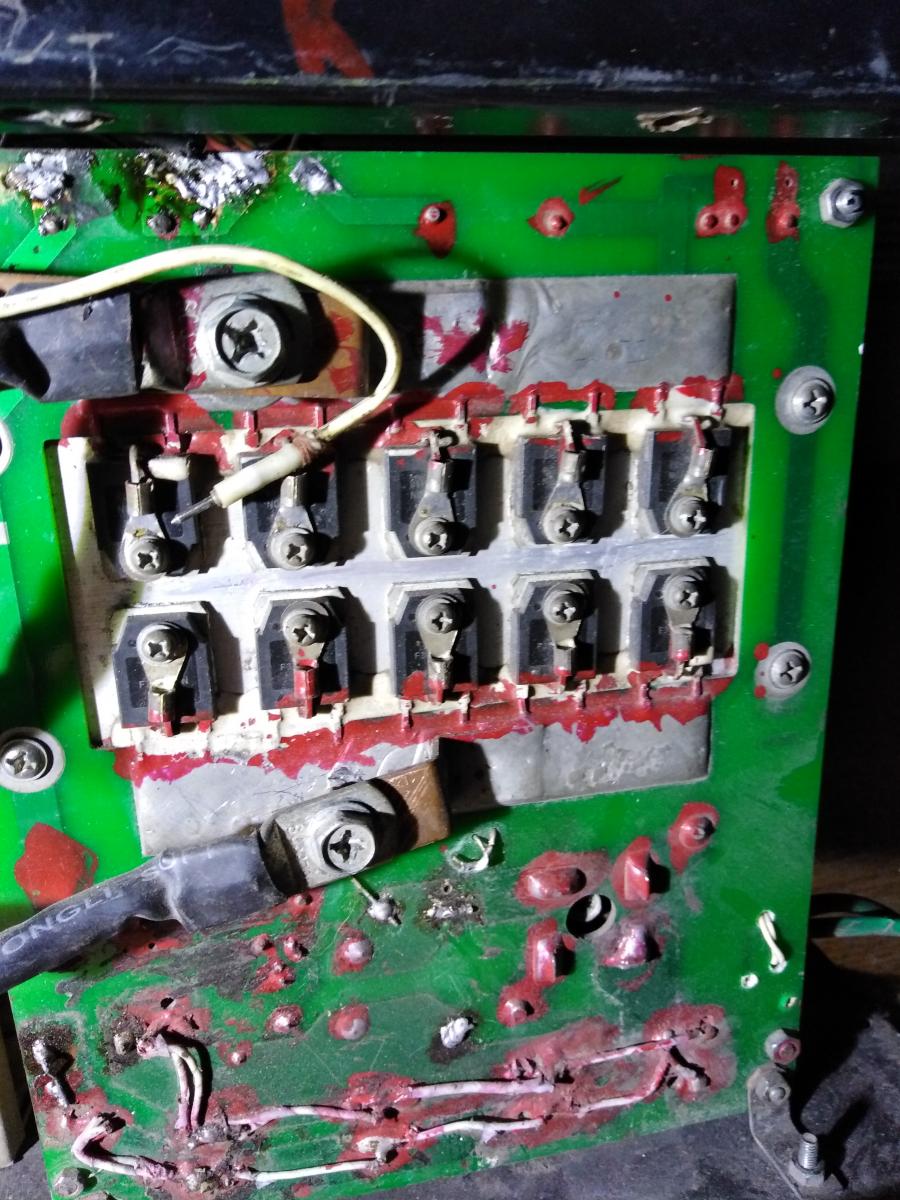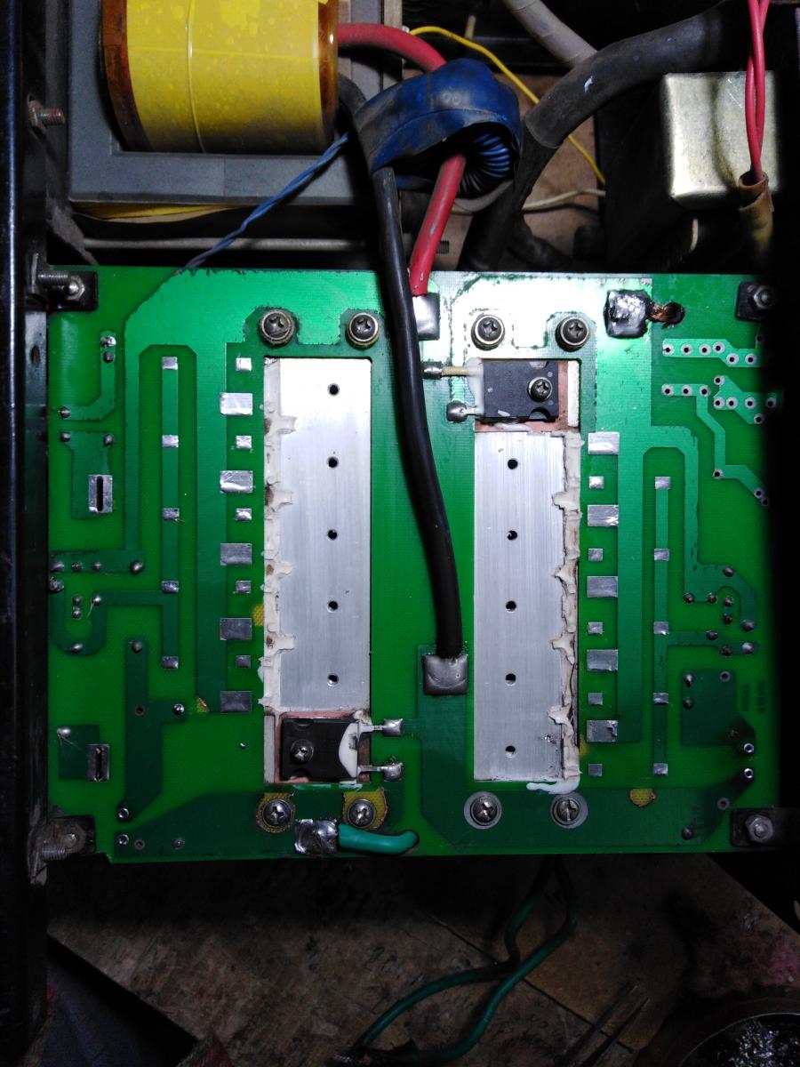 были пробиты два транзистора ( схема "косой" с самопитанием) из четырёх - поменял все четыре, диоды размагничивающие целые. Проверил выход с драйверов на затворы транзисторов.