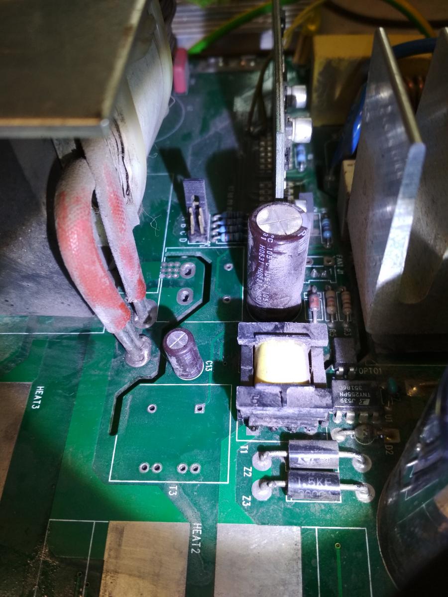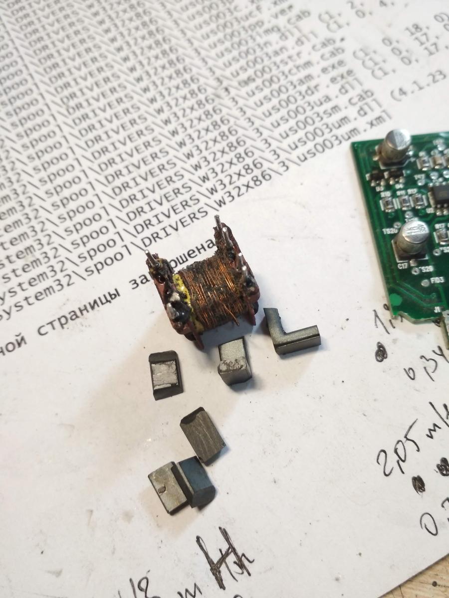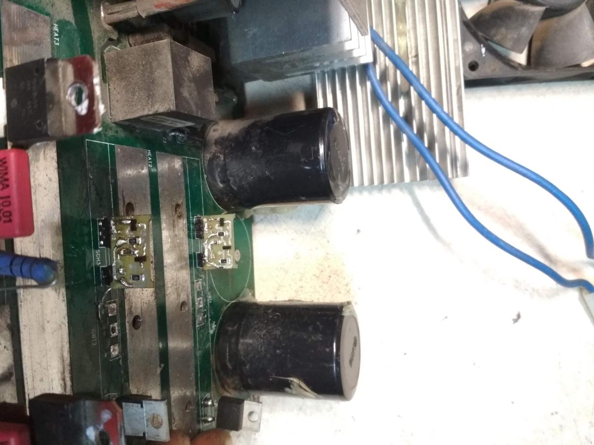 Потом шваркнул в том же нерабочем драйвере резистор 4.7Ом. Заменил - на затворе нет импульсов. Вместо силовых транзисторов пока поставил емкости 2200пик. Мои пробные силовые транзисторы выжили. Пока оставил до понедельника. Что смотреть? Пишут ТТ снизу у них подгорает. А может где то железо треснуло в ТТ или ТГР.