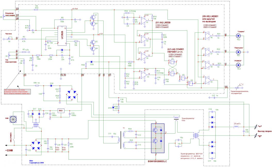 Заказал новый, сварку отложил на время. Получил з/ч, заменил, но проблема осталась. Давай проверять плату управления. Импульсов на выходе контроллера SG3525 не было.