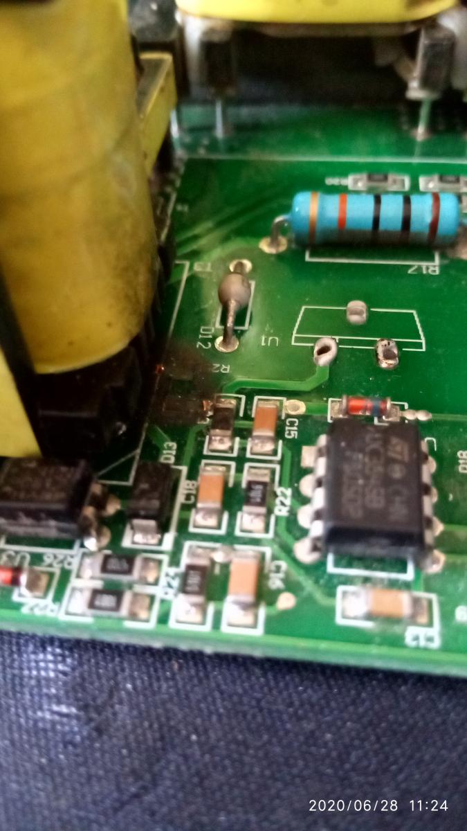 Всем привет.Результат ремонта.Замена транзистора,микросхемы 3845в,трансформатора,смд 1ком,в место сгоревшего смд просверлил плату и поставил 1ват 2,2ом резистор так как погорели дорожки пайка на