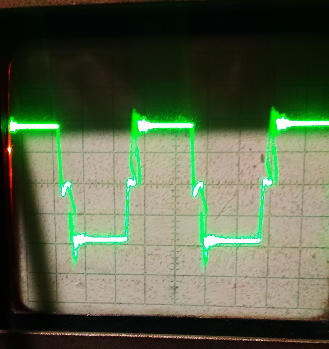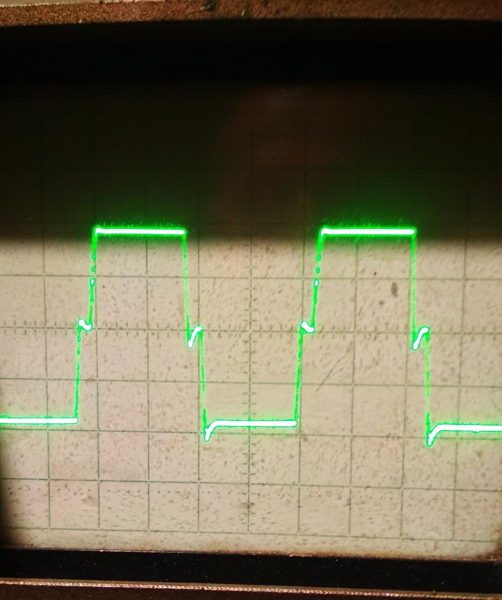 Запаял резисторы, посмотрел осциллограммы и смутили меня пологие фронты и спады управляющих импульсов, хотя для частоты 55 кГц вроде и не такие пологие.