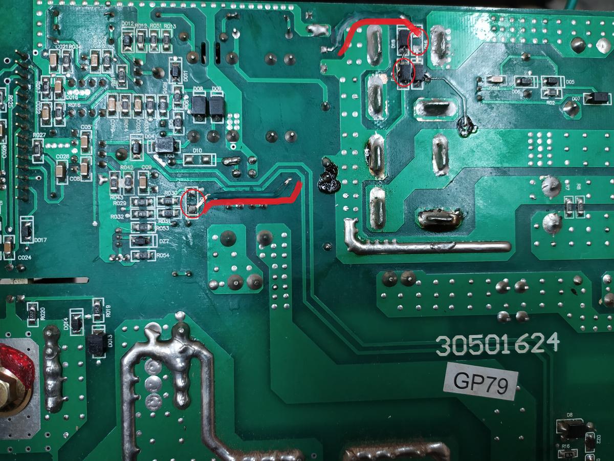 около диодного моста черная копоть разряда и облезшая маска дорожки,выделил красной стрелкойВложение 11491 Вложение 11492 и так же были пробиты диоды D18,D16