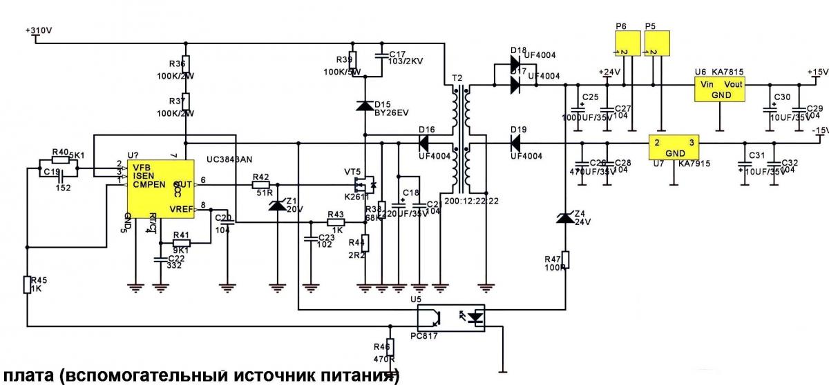 Подскажите пожалуйста кто нибудь какое сопротивление должно быть у R38? Схему нарисовал по плате, желтым цветом помечены сгоревшие детали.