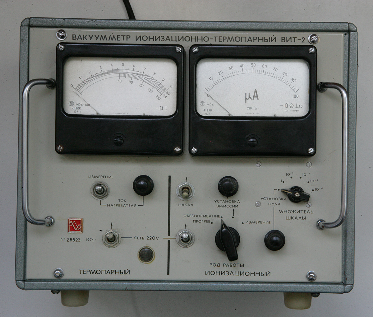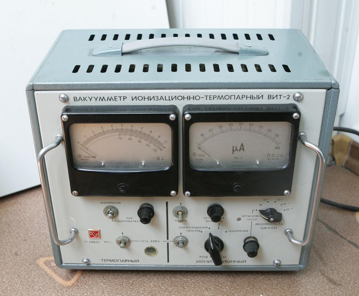 Вакуумметр ионизационно-термопарный ВИТ-2 предназначен для измерения давления в диапазоне 1х10-5 - 20 Па. ВИТ-2 эксплуатируется в комплекте с термопарными (ПМТ-2, ПМТ-4М) и ионизационными (ПМИ-2) манометрическими преобразователями.