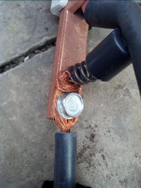 2. Держатель электродов прикручен к кабелю я бы сказал немного не так как я ожидал. Кабель просто поделен на половины и прижат болтом, причем прижато процентов 50 кабеля, это при том, что зажим массы вроде нормально оконцован. Вот и возник вопрос, это такая фишка с электрододержателем, или наконечники для оконцовки на моем закончились?