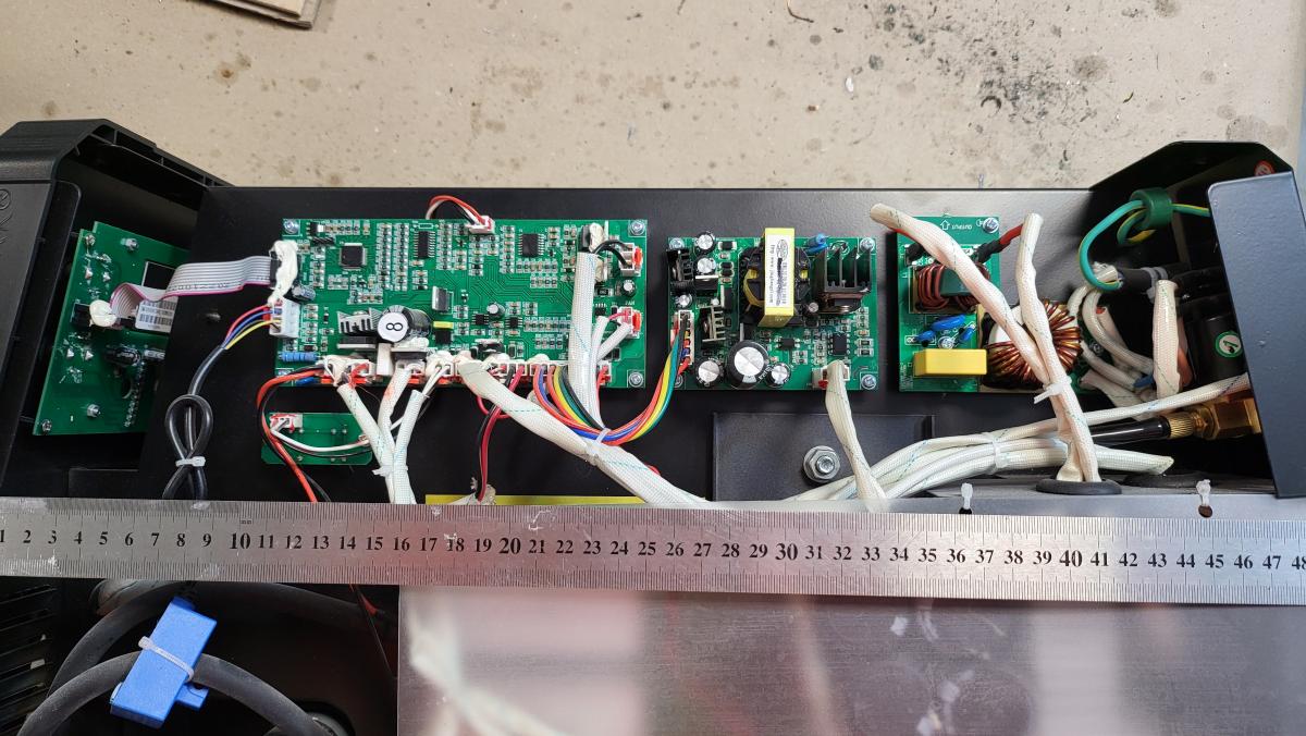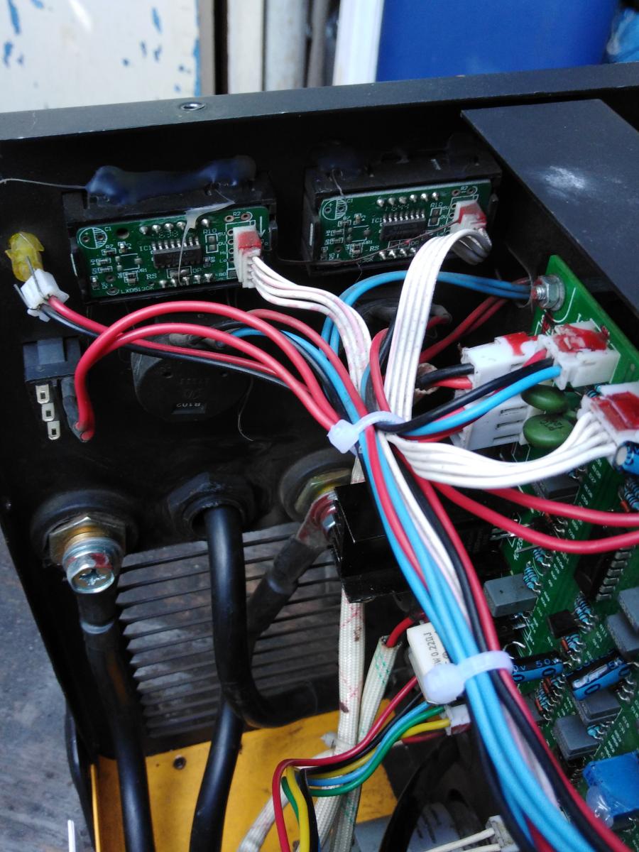 В принципе аппарат варит нормально, показометры там просто лишние. Кабель на передней панели для быстрой смены полярности алюминиевый, выходной каскад силовой по схеме полумост, дежурка стандартная. Собственно вот внутренности.