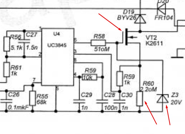 Здравствуйте. Сегодня получил UC3843B и транзистор. Перед тем как поставить, померил всю обвязку и вторичку. Все нормально. Поставил мс и транзистор, аппарат завелся. Но.... Померить добром ничего не успел.... Секунд через 20 взорвался резистор 2.2 ом (они были уже менены два паралельно по 10 ом 0.125), сответственно транзистор, стабилитрон. На скрине стрелки. Подозреваю, сто 43 тоже накрылась.... Когда пробовал включать через лампочку, аппарат начинал заводиться, но как то странно - лампочка вспыхивала - гасла, трансформатор слышно как работал, на вторичке мерил 15в, потом лампочка постепенно тухла, наверно из за терморезистора который рядом с реле стоит.Вложение 3976