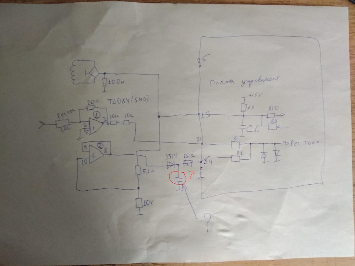С выхода этого операционника сигнал через диод и резистор 15к поступает на 24 ногу платы управления и дальше через резистор суммируется с сигналом с регулятора тока. Может эта цепь и давит ток.