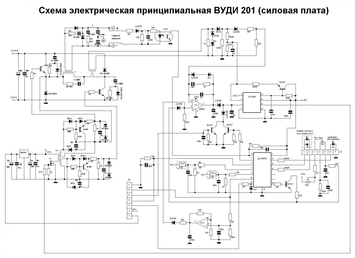 Формула расчёта напряжения в зависимости от тока при сварке в СО2 : U= 14+0,05*I , т.е. при 200А будет 24В., при 180А.-23В., при 160А.-22В.,и т.д. ,при этом сопротивление дуги (вашего реостата) должно быть U/I=R . Примерно выходит что на 0,2 Ом при 100А примерно должно быть 19В. Штука ещё в том, что судя по схеме в начале ,у этого аппарата отсутствует контроль напряжения по выходу (кроме антизалипайки), контроль ведётся через ТТ ,соответственно конролируется мощность первичной цепи, характеристика пологая и соотношение UI прилично зависит от нагрузки. Но это чисто мои рассуждения. К стати, если внимательно посмотреть на схему, то видно что микроконтроллер в самом преобразователе регулировочной функции не несёт, только контроль температуры ,напряжения питания, и антизалипайка ,т.е. только защитные функции .
