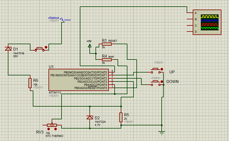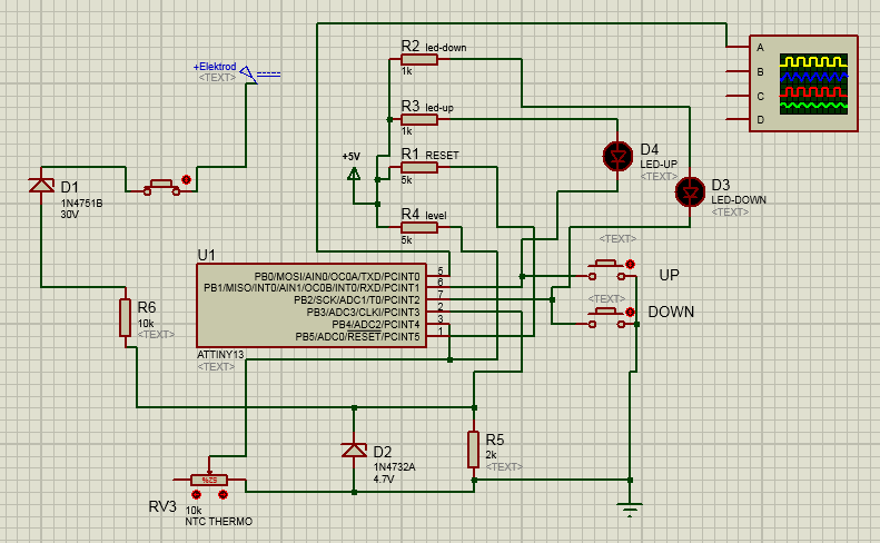 Термодатчик. Разогреваем до требуемой температуры и зажимаем одновременно UP\DOWN. Заносится значение в eeprom. При этом значении удерживается заданный максимальный шим, при дальнейшем увеличении температуры макс. шим устанавливается >95% и удерживается, пока температура не придет в "норму". Добавил: при обрыве\отсутствии датчика настройка макс. ШИМ игнорируется, и при горении дуги заполнение стремится >95%. Если термодатчик не нужен, вместо него установить резистор от 5 до 15 килоом.