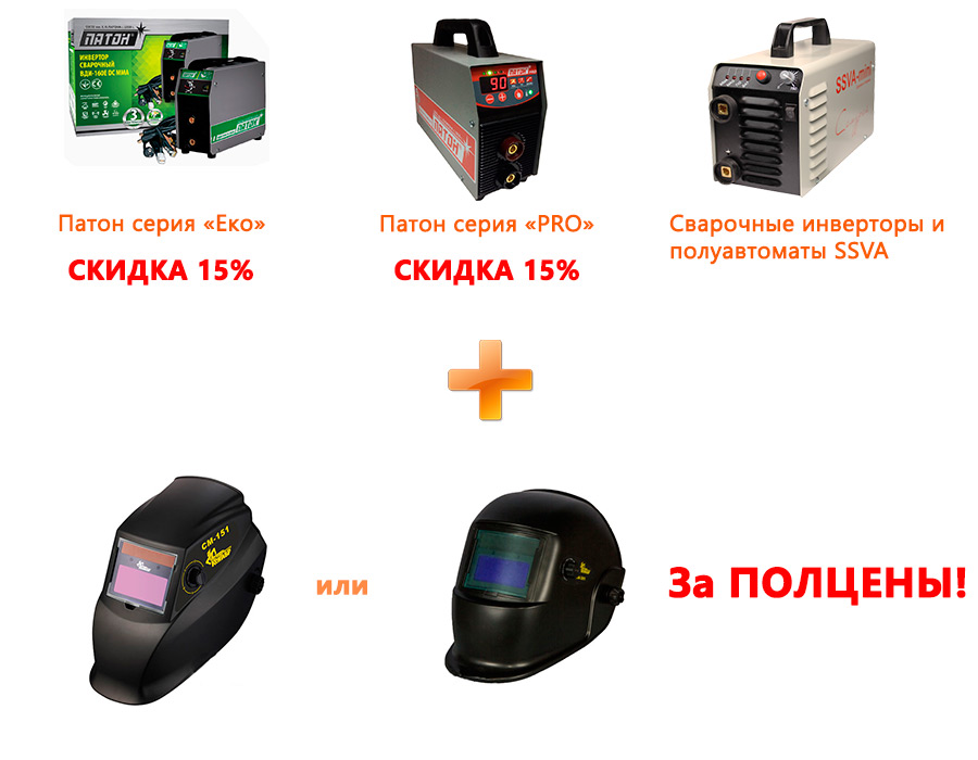 К сварочным инверторам серии "Эко": Патон ВДИ-160Е, Патон ВДИ-200Е и ВДИ-250Е, серии "Pro": Патон ВДИ-160Р, Патон ВДИ-200Р и ВДИ-250Р получай не только гарантированную СКИДКУ 15%, но и маску-хамелеон Кентавр СМ-151, или Кентавр СМ-301 за ПОЛЦЕНЫ! Так же, акция "Маска-хамелеон за ПОЛЦЕНЫ" распространяется на сварочные инверторы и полуавтоматы SSVA (Харьков): ssva mini самурай, ssva 160-2, ssva-270, ssva-mini-p самурай, ssva 180 p, ssva 270 p