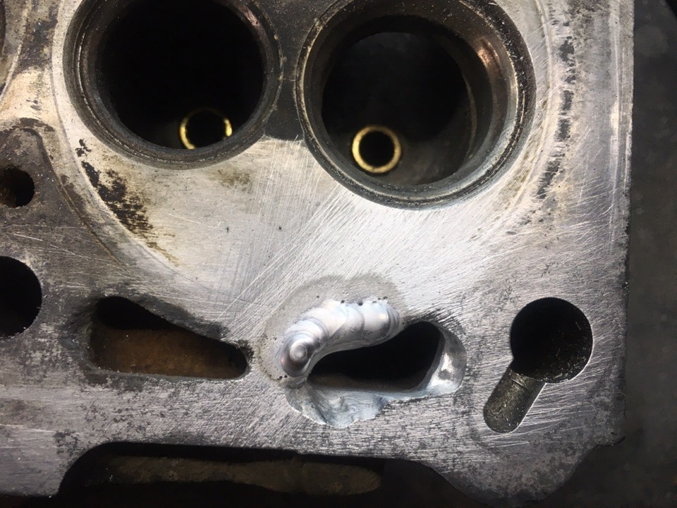 Не комплексуйте, у вас все правильно виходить. Пори в навколошовній зоні — сліди роботи осцилятора. У вас здається Верона, тому найперше спробуйте трохи зменшити частоту, "погратися" трошки балансом. По конкретним цифрам тяжко щось радити, бо вони можуть суттєво відрізнятись на різних моделях. Обов'язковою умовою при підготовці до зварювання мусить бути ідеальна обробка місця ремонта борфрезою і підігрів пропановим пальником. Цим досягається максимальна чистота в місцях зварювання і зменшить час розігріву головки за допомогою дуги апарата. Цілком гладкої поверхні в навколошовнвній зоні досягнути тяжко. На мою думку дрібні кратерки зникнуть після перешліфовки і це краще ніж перегрівати головку, досягаючи цілком гладкої поверхні.
