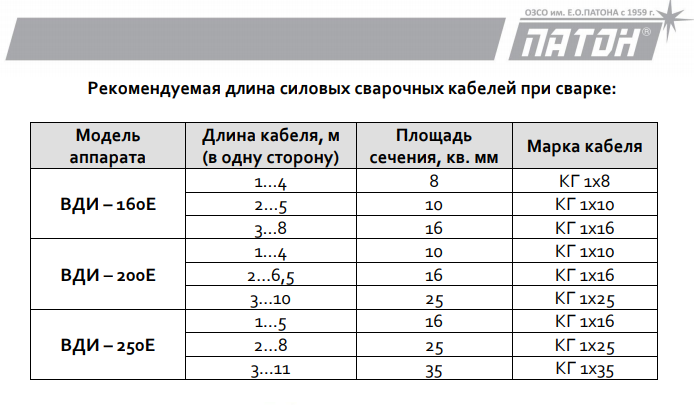 Дуговик в этом полуавтомате 160А. Полуавтомат оптимизирован для сварки тонкого металла (кузовной ремонт), который производится на токах до 100А. Но даже при максимальных токах, согласно данным того же Патона, сечения достаточно. На практике кабеля не греются.Вложение 9148