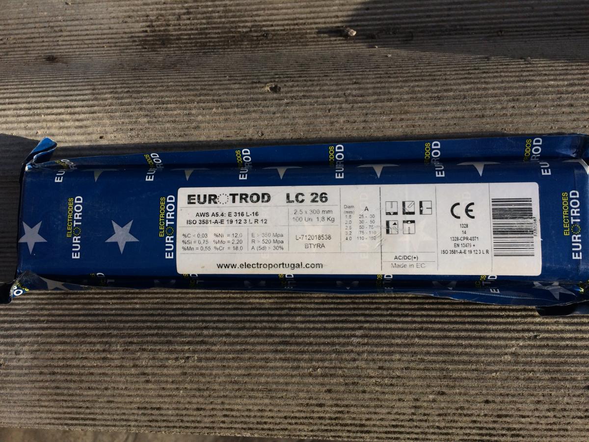 Электроды Eurotrod LC26 (AWS 5.4: E316L-16), диаметр 2.5 мм. Производство Португалия. Доставка моряками в Одессу. Из Одессы - по всей Украине. Спасибо одесситам - выручают, продают по разумной цене, а не как в интернет-магазинах по цене золота и ждать нужно месяцами.