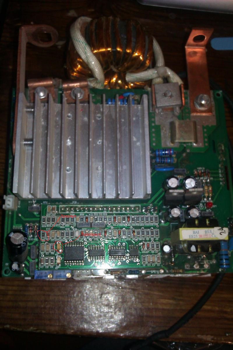 Произошло следующее- варил себе,варил а во время отдыха решил спрыгнуть на пол (был уже тоключен от розетки). При последущем включении послышались щечки и сварочник был тут-же отключен. Вскрытие показало отвалившиеся две стойки-контакта от платы и сгоревшие smd резисторы. Сами силовые транзисторы выглядят целыми, даже пыль на них лежала ровным слоем)) На плате управления нашел только внешне подгоревшие резисторы RS1, RS2 - Тестером звонятся как целые.