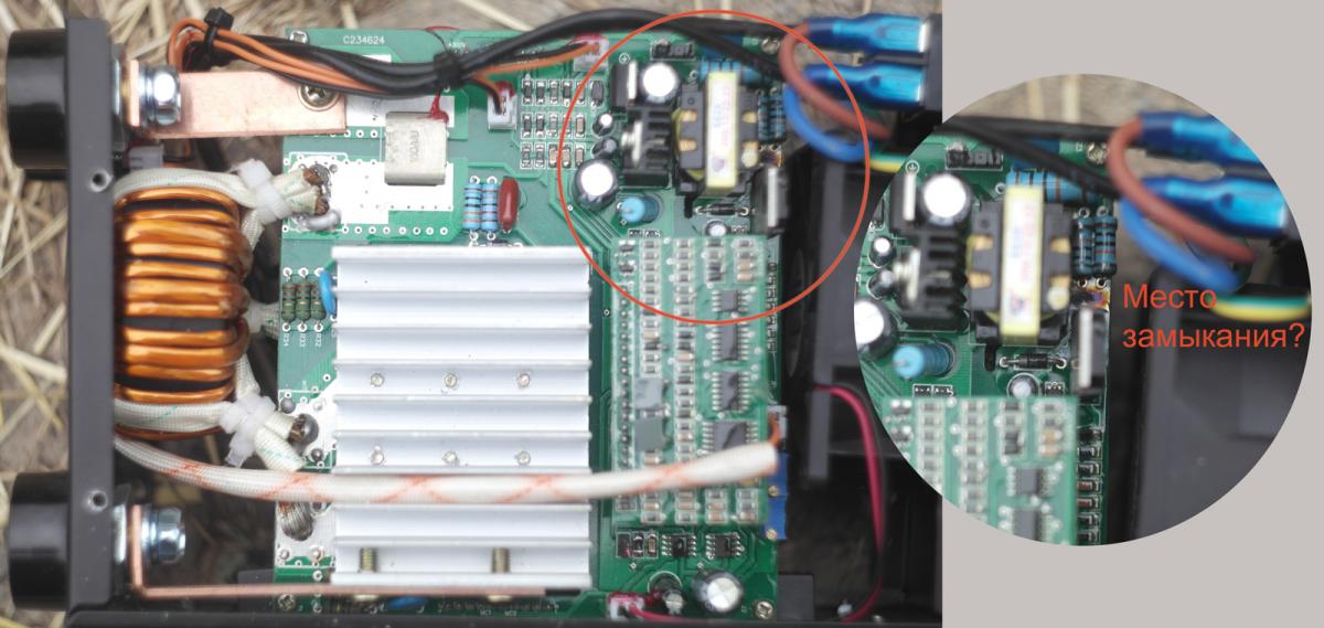 Вот на фото место, где на плате видны разводы похожие на следы КЗ.