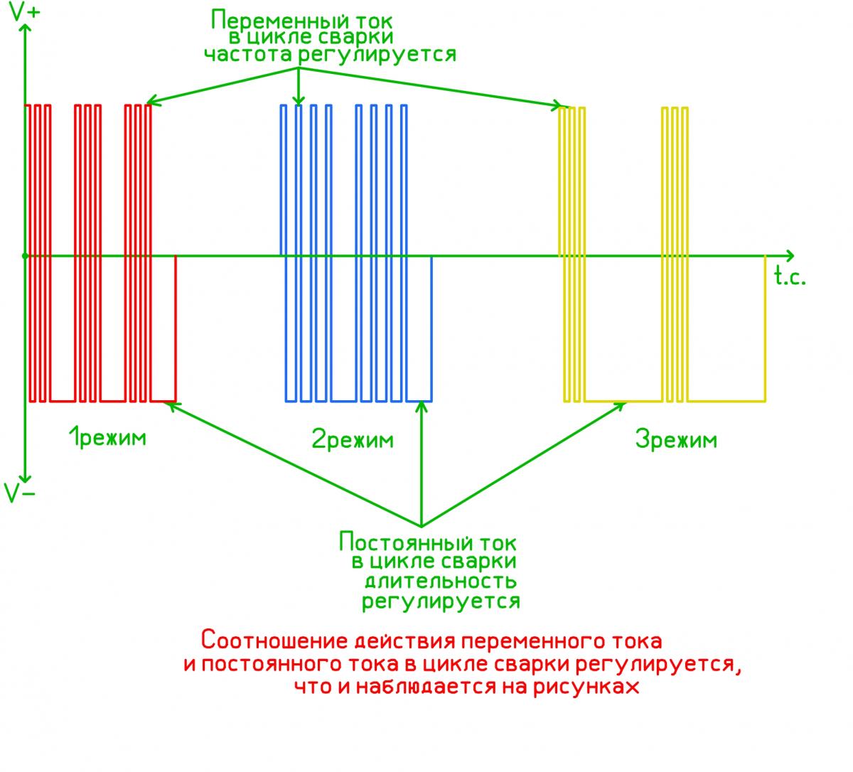 То есть имеем ток переменный, потом нет тока, потом идёт импульс в данном случае отрицательной полярности, потом нет тока и снова переменный ток - соответственно все эти временные и частотные параметры модно выставить на аппарате.
