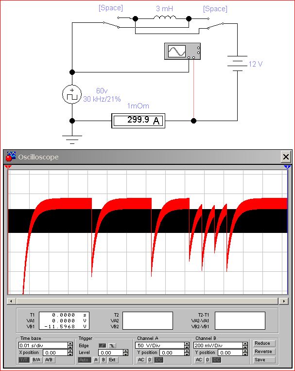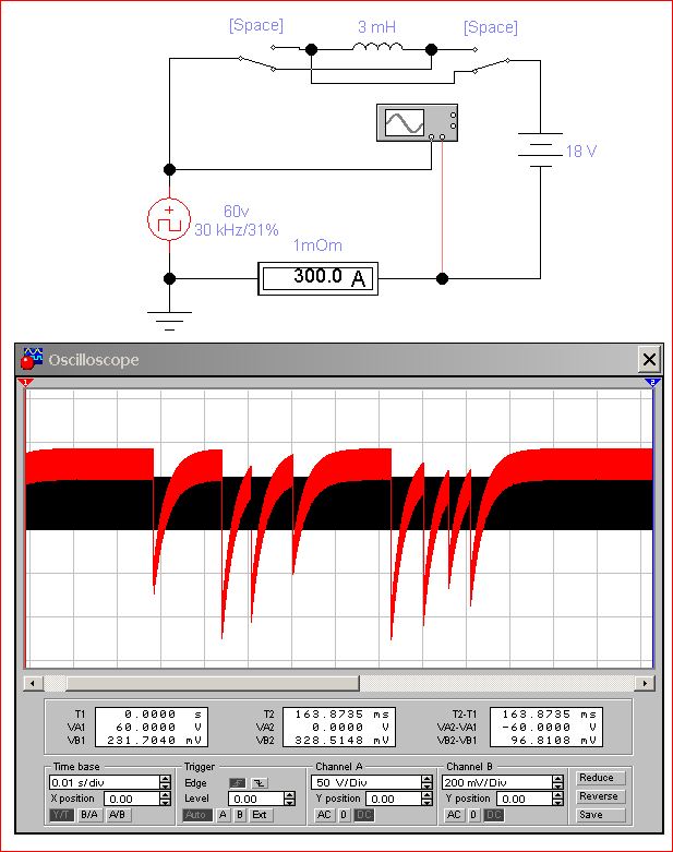 Как то вы с поведением дросселя по переменке заинтриговали, дай думаю в симуляторе поиграюсь на примитивах. Взял генератор ШИМ с напряжением 60в, частотой 30кГц и скважностью 21% (при таком проценте как раз в нагрузку 12в гонит 300А), нагрузил его через дроссель на 12в (это иммитация напряжения дуги). И поставил два переключателя что бы менять концы дросселя местами (иммитировать кнопкой переменку приминительно к дросселю). Индуктивность поставил такой что бы пульсации тока были около 30% (кстати там не миллиГенри, а микроГенри, просто из за проблем со шрифтами отображается некорректно) . Красным на осцилографе ток через амперметр, его сопротивление 1мОм, а черный просто прямоугольники ШИМ. Переходные процессы это я менял полярность дросселя.