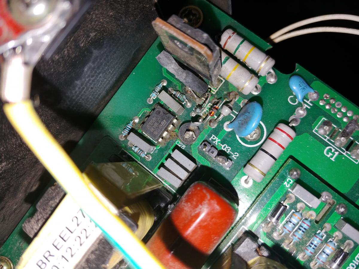 Когда работал сварочным инвертором взорвался конденсатор 47мкФ/50в в области дежурного питания (на рисунке будет видно). Вышедшие из строя элементы были заменены, согласно схемы.