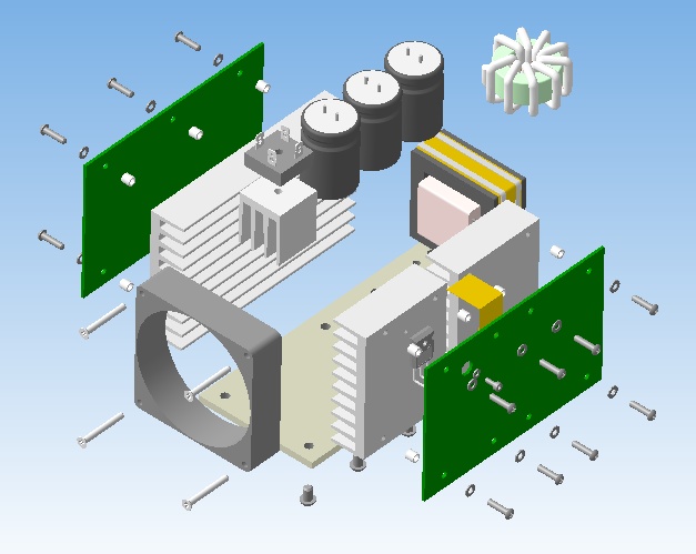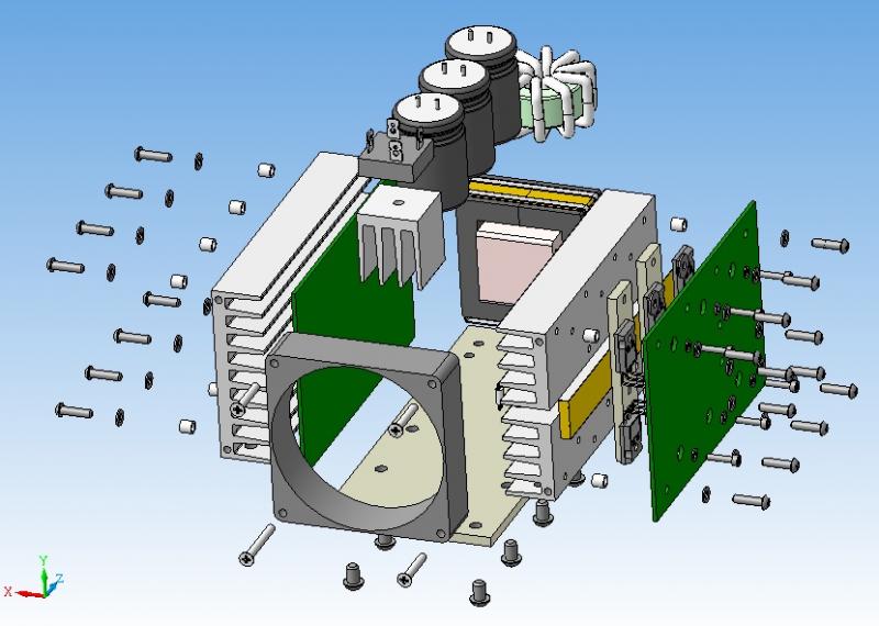 Идея в том, чтобы сделать трубу без утечек воздуха и так,чтобы компоненты не находились внутри неё (кроме моста и конденсаторов). Там не нарисована верхняя плата (управления), трансформатор, дроссель и много чего еще.