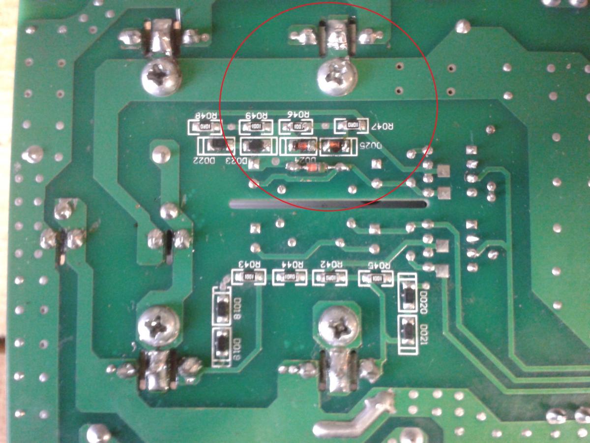 Далее, замерил напряжение на затворах транзисторов. Оказалось, что на затворах нижнего плеча отсутствуют запирающие напряжения из-за пробитого стабилитрона D25.