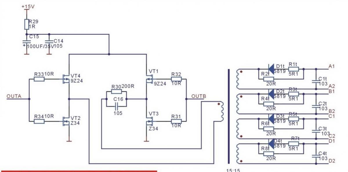Всё нормально на эмиттерах z24 и 9z24 (между ними) 16 вольт а на затворах силовых транзисторов меньше всего 11 вольт