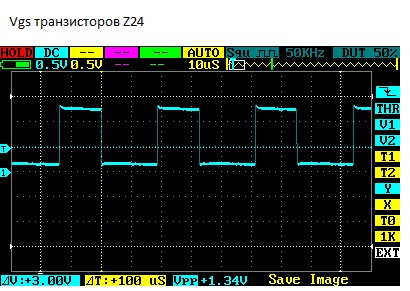 *При этом замерил напряжение с выходов трансформатора где подключаются затворы силовых транзисторов (на разных плечах).*
