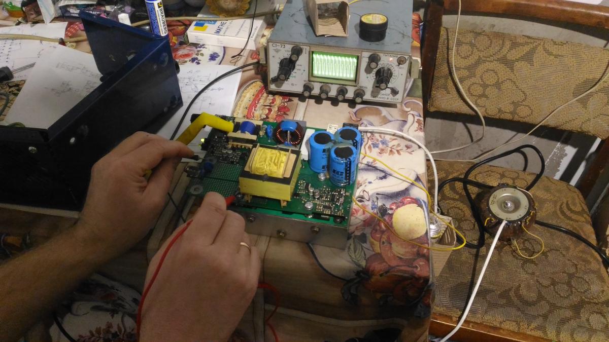 На болтах трансформатора ВЧ первичка по мануалу относительно НТ- форма соответствует описанию размах около 100В при входном = переменка 60В. Фронты завалены на одном болте в одну сторону на втором в другую - все гут.